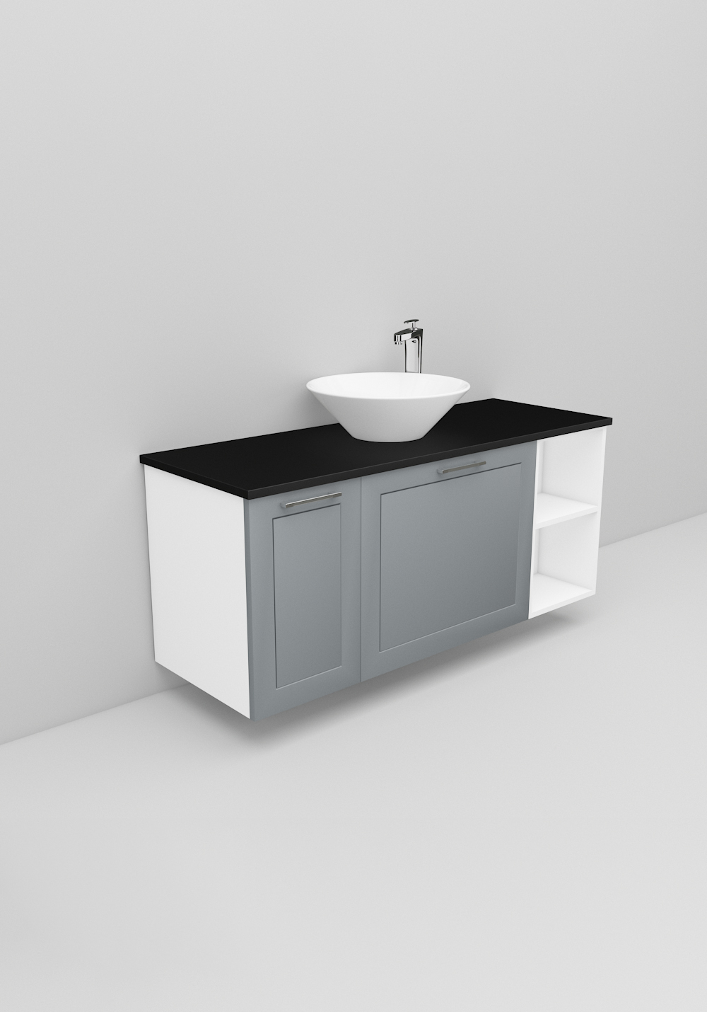 Flexline är badrumsmöbler med tidlös design och många valmöjligheter. Möblerna finns i varianter med både luckor och lådor med Soft Close-funktion, i bredder 600, 900 och 1200 mm och med flera olika utföranden på fronterna som sätter prägel på din möbel. Lyxigt fristående handfat på bänkskiva i Solid Surface marmor eller svart bänkskiva ingår. Köp till handtag, blandare, bottenventil och vattenlås.