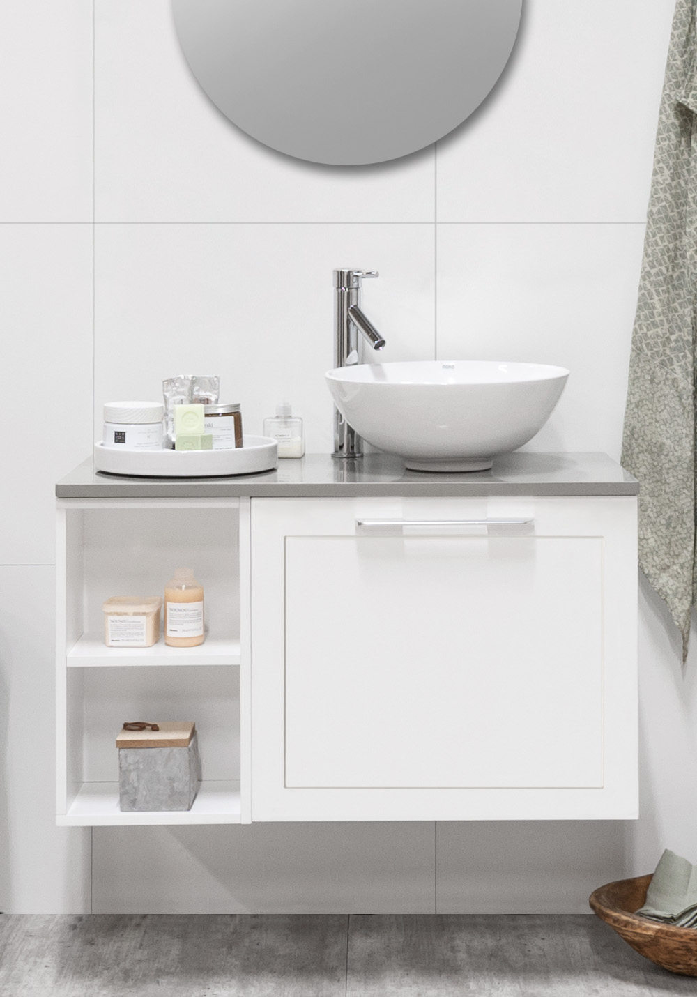 Flexline är badrumsmöbler med tidlös design och många valmöjligheter. Möblerna finns i varianter med både luckor och lådor med Soft Close-funktion, i bredder 600, 900 och 1200 mm och med flera olika utföranden på fronterna som sätter prägel på din möbel. Lyxigt fristående handfat på bänkskiva i Solid Surface marmor eller svart bänkskiva ingår. Köp till handtag, blandare, bottenventil och vattenlås.