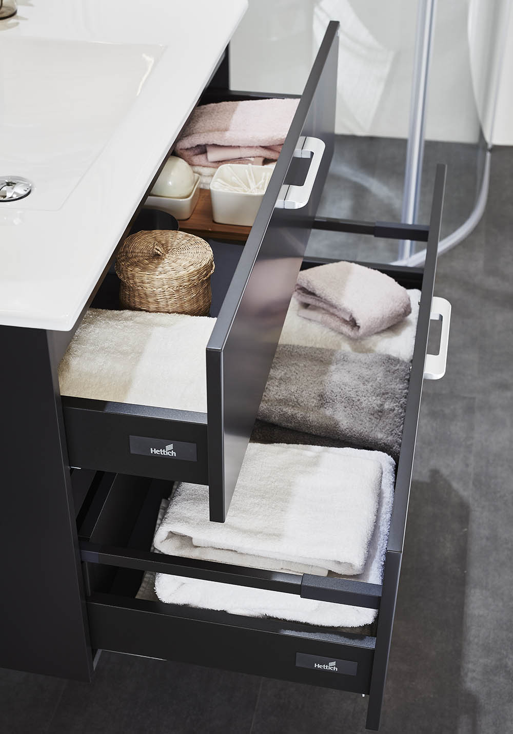 En badrumsmöbel som håller en enhetlig och funktionell design rakt genom. City har ett stort urval av bredder, färger och detaljer som enkelt kan anpassas för just ditt badrum. Välj mellan tre nedsänkta tvättställ i porslin eller betong. Om du hellre vill prägla din möbel med en vacker bänkskiva och fristående handfat, finns den möjligheten också. City tvättställsskåp har mjukstängande lådor med fullutdrag. Justerbara upphängningsbeslag för enkel installation och justering. Lådinredning och uttagbar lådmatta ingår. Levereras monterad. Köp till handtag. Borrmarkeringar handtag: CC 64, 128, 160, 256, 320.