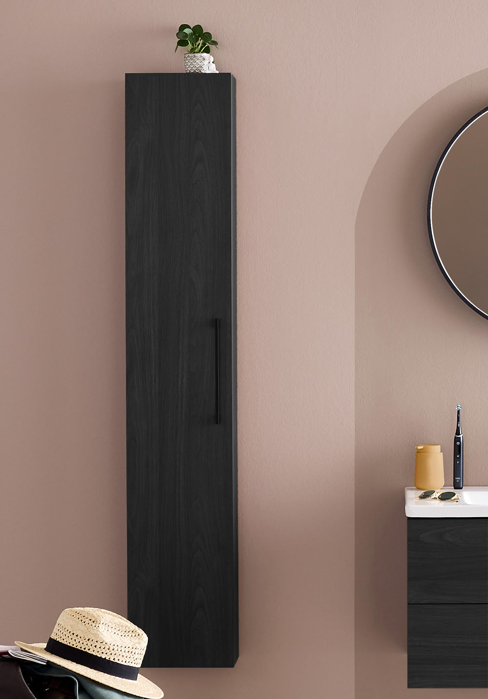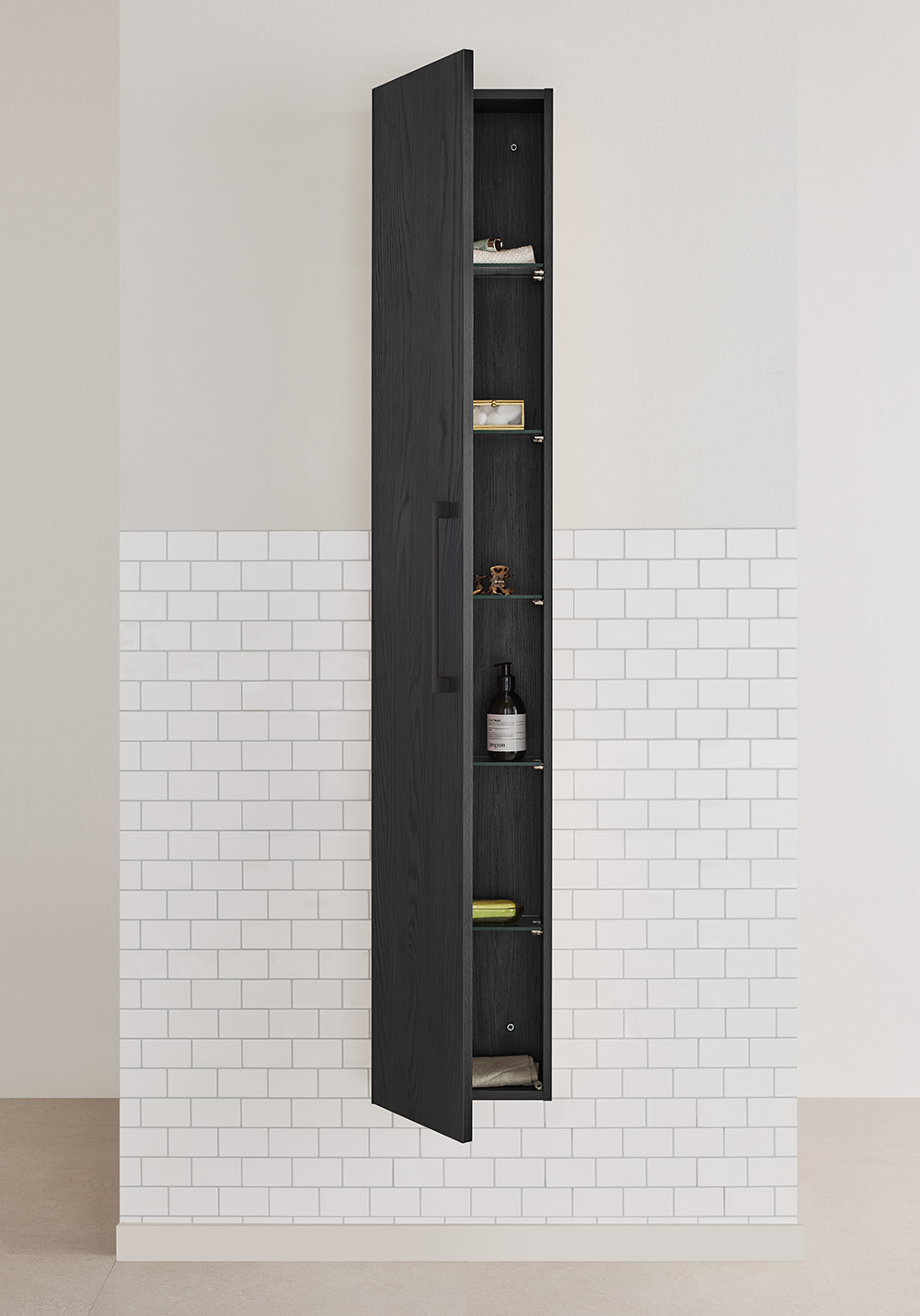 Noro Multi är ett stilrent och funktionellt högskåp i ett kompakt mått som skapar ordning och ger extra förvaring i badrummet. Multi är utrustat med fem flyttbara hyllor i klarglas. De självstängande och dämpande gångjärnen ger en mjuk och tyst stängning, samtidigt som det bidrar till en känsla av kvalitet i varje detalj. Skåpet kommer med svart handtag. Högskåpet levereras monterat och skåpsluckan kan monteras höger- eller vänsterhängd. Köp till eluttag.