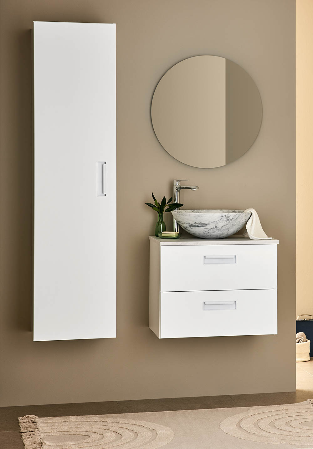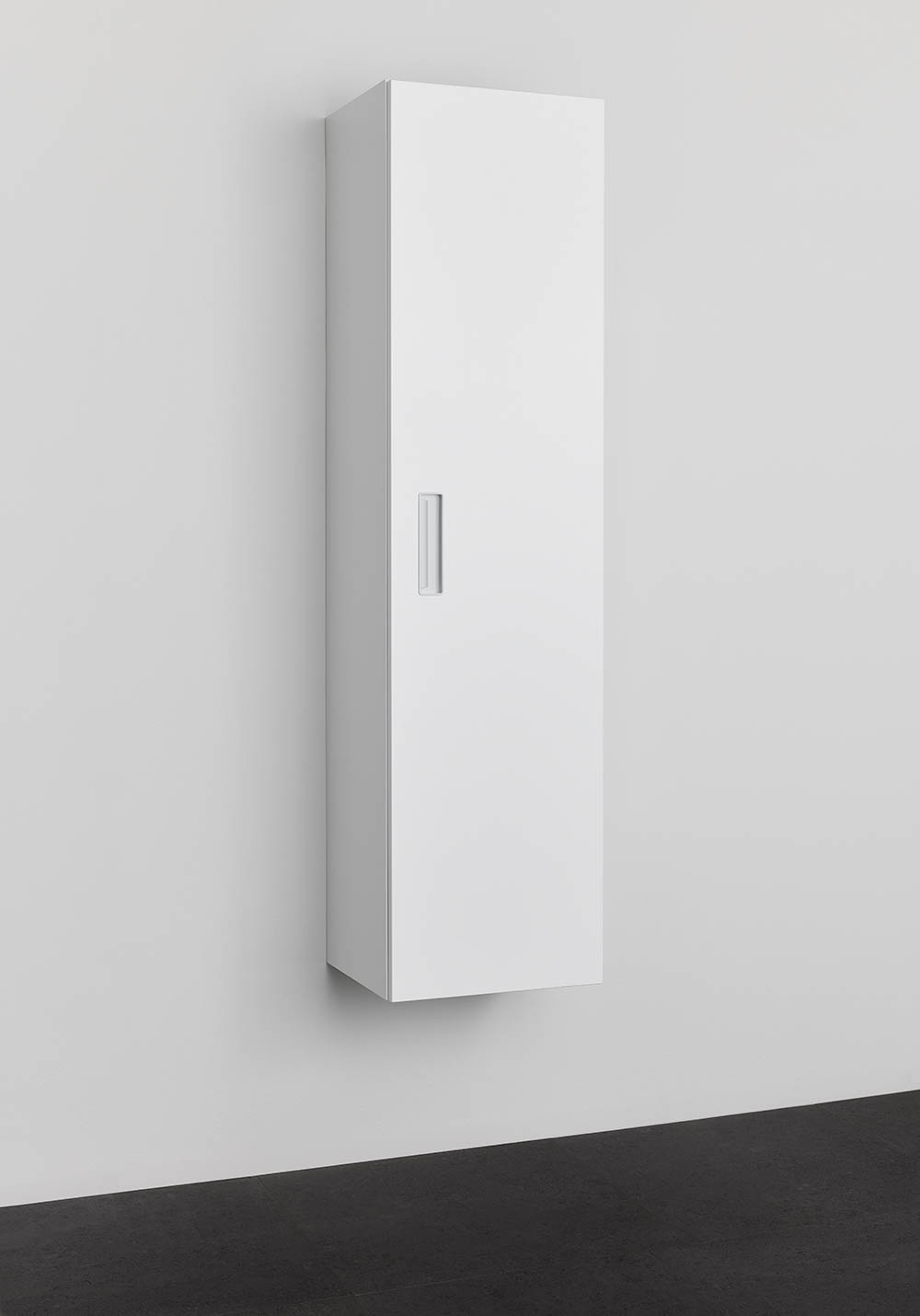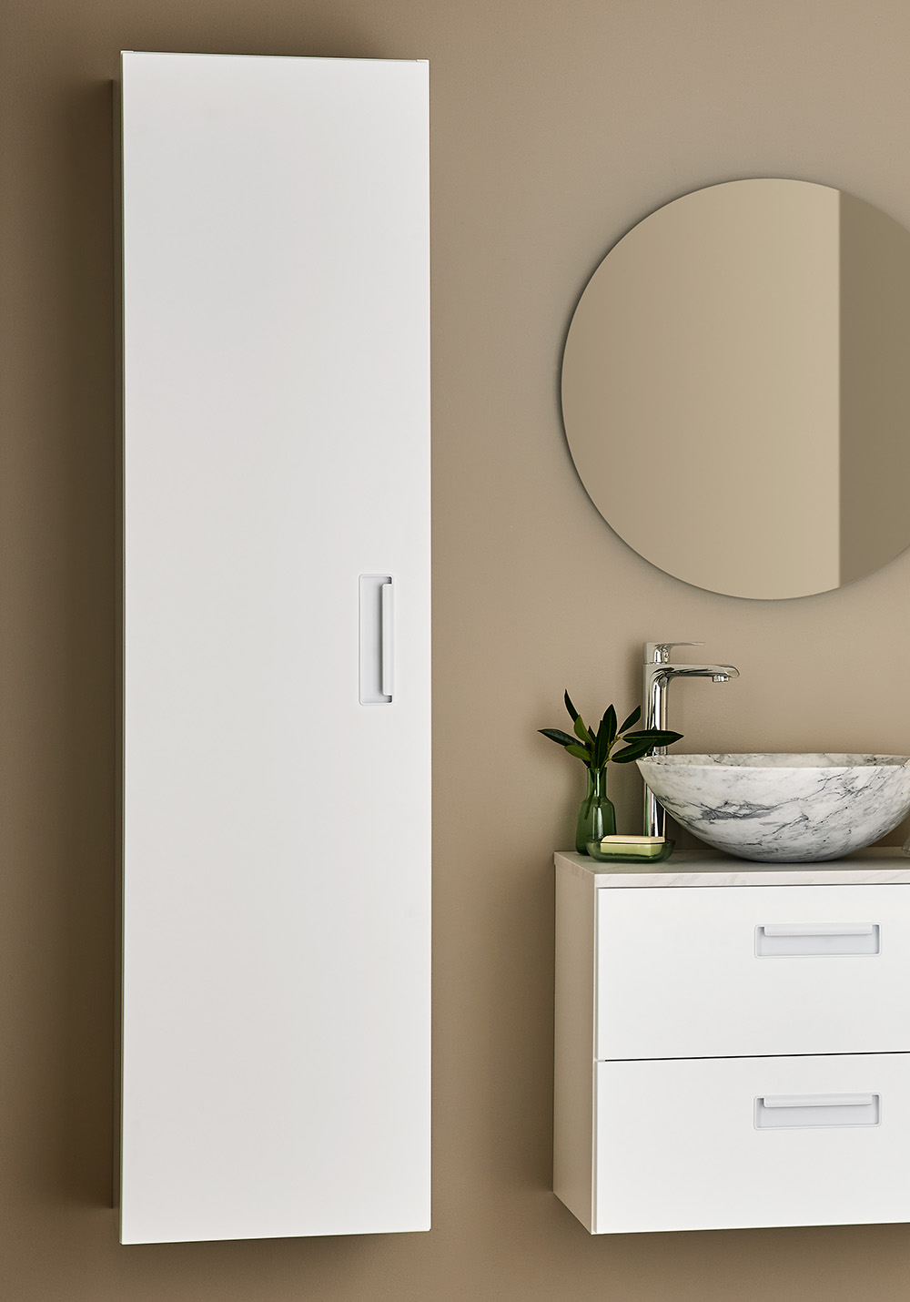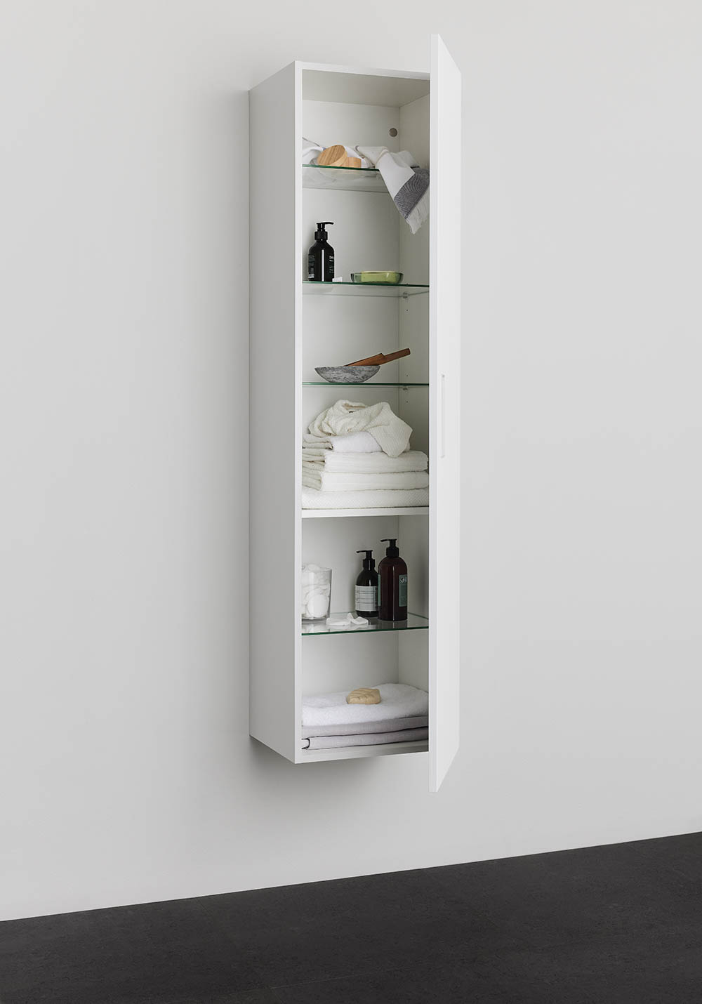 Noro Relounge högskåp med trendig design, ger dig möjligheten att skapa ditt personliga badrum med integrerade handtag. Högskåpet är rymligt och anpassat för att få plats med handdukar och annat som behövs i ett badrum. Finns i svart trämönstrad yta och lackerad matt vit. På insidan är skåpen vita och har fyra flyttbara glashyllor samt en fast hylla i mitten. Levereras monterad och du väljer själv om dörren skall hänga på höger eller vänster sida vid installationen. Köp till eluttag.