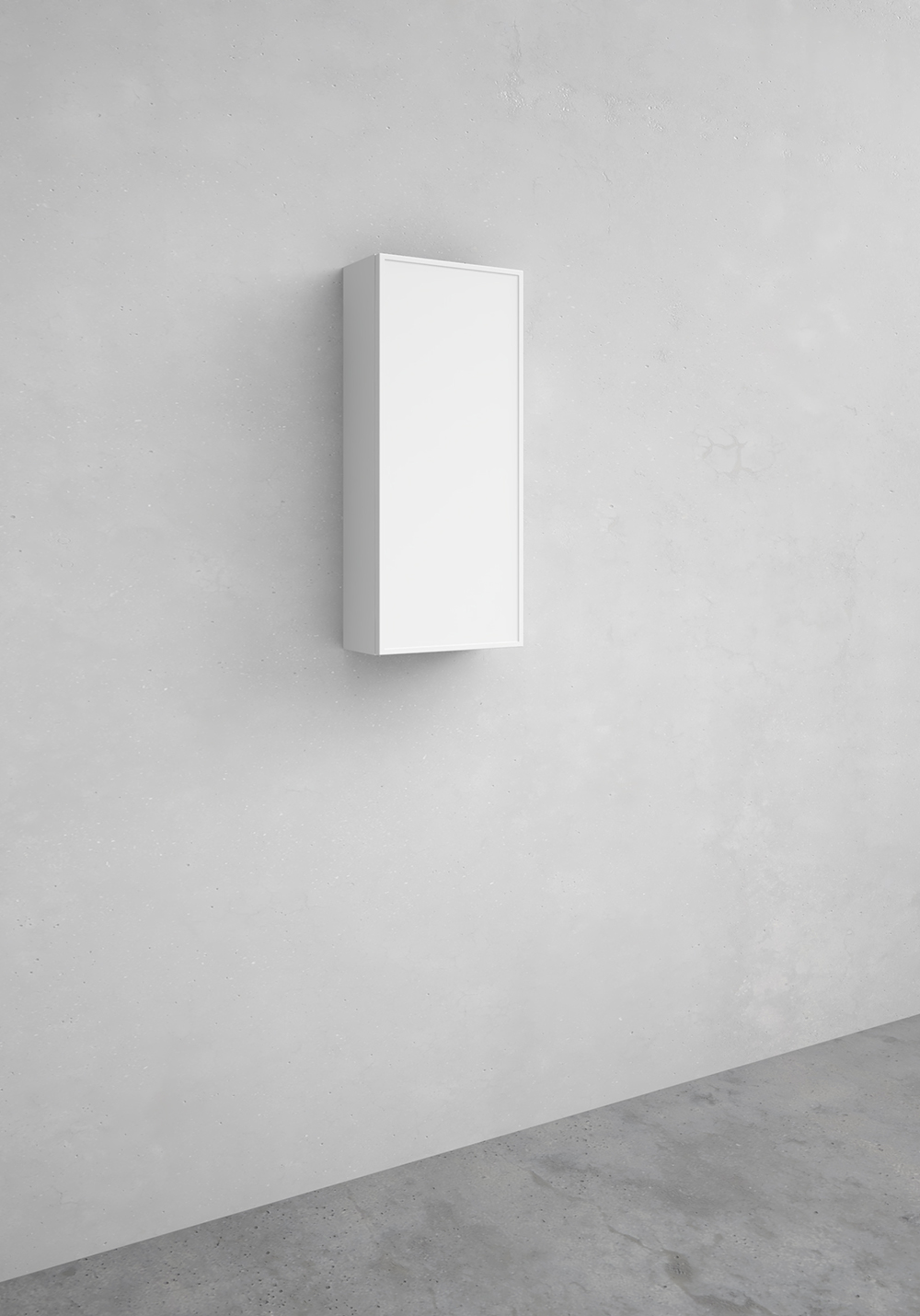 Mjukstängande dörr som kan monteras till höger eller vänster. Två justerbara glashyllor i höjdled. Levereras monterad. Grepp undertill.