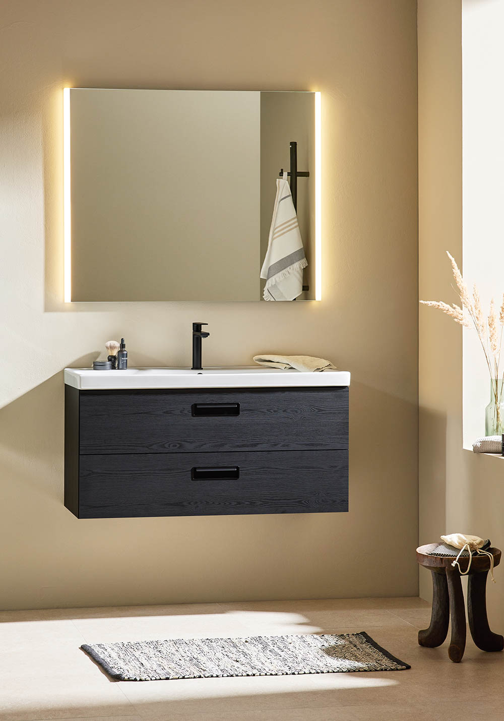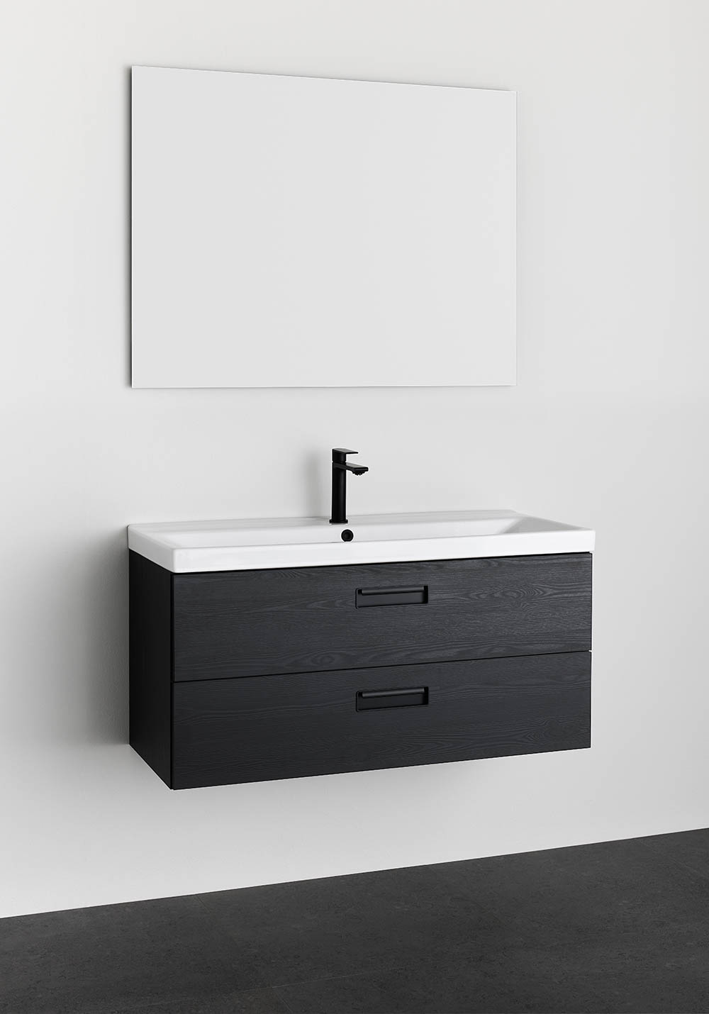 Noro Relounge badrumsskåp med porslinstvättställ i trendig design ger dig möjligheten att skapa ditt personliga badrum med sina unika mått och integrerade handtag. Relounge är en designad badrumsmöbel som ger en lyxig känsla och passar även ett smalt badrum. Finns med vit matt finish samt svart trästruktur och i flera bredder och chansen är stor att du hittar något som passar just ditt badrum. Det nedsänkta tvättstället i porslin har en rymlig och mjukt formad ho, samt överfyllnadsskydd. Levereras monterad, förberedd för både vägg- och golvavlopp. Enkel installation med justerbara upphängningsbeslag. Köp till bottenventil, avloppssats, eluttag och tvättställsblandare.