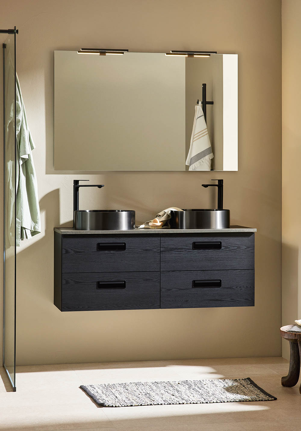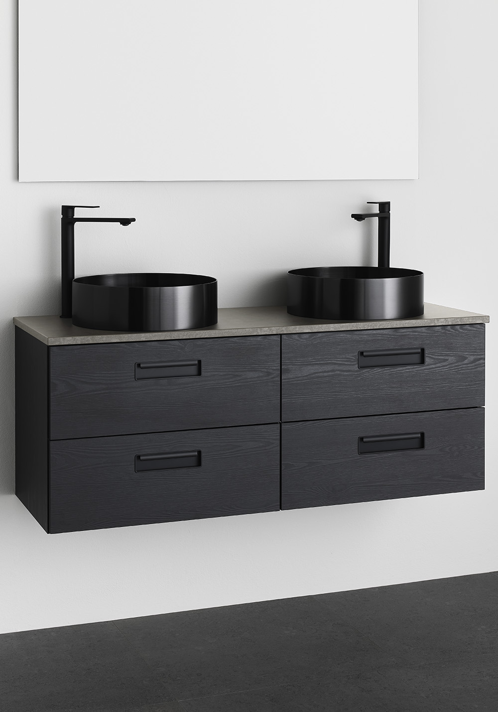 Noro Relounge badrumsskåp med bänkskiva i trendig design ger dig möjligheten att skapa ditt personliga badrum med sina unika mått och integrerade handtag. Relounge är en designad badrumsmöbel som ger en lyxig känsla och passar även ett smalt badrum. Relounge finns med vit matt finish samt svart trästruktur och i flera bredder, och chansen är stor att du hittar något som passar just ditt badrum. Finns med vit matt finish samt svart trästruktur och i flera bredder och chansen är stor att du hittar något som passar just ditt badrum. Bänkskivan är av MDF med slittålig yta av melamin. Välj till ett av våra fina fristående tvättställ. Levereras monterad, förberedd för både vägg- och golvavlopp. Enkel installation med justerbara upphängningsbeslag. Köp till bottenventil, avloppssats, eluttag och tvättställsblandare.