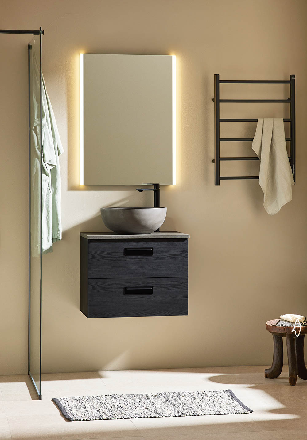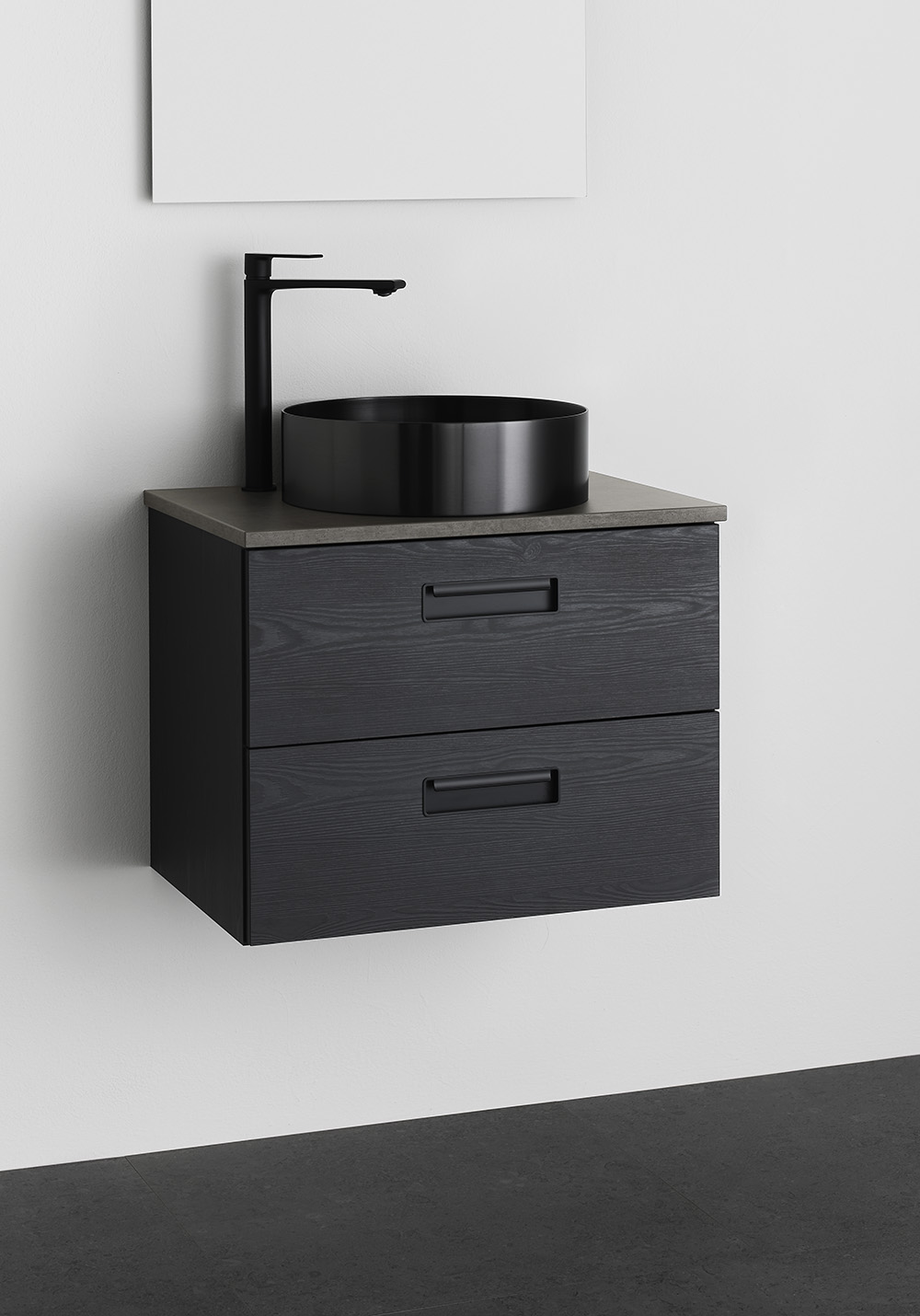 Noro Relounge badrumsskåp med bänkskiva i trendig design ger dig möjligheten att skapa ditt personliga badrum med sina unika mått och integrerade handtag. Relounge är en designad badrumsmöbel som ger en lyxig känsla och passar även ett smalt badrum. Relounge finns med vit matt finish samt svart trästruktur och i flera bredder, och chansen är stor att du hittar något som passar just ditt badrum. Finns med vit matt finish samt svart trästruktur och i flera bredder och chansen är stor att du hittar något som passar just ditt badrum. Bänkskivan är av MDF med slittålig yta av melamin. Välj till ett av våra fina fristående tvättställ. Levereras monterad, förberedd för både vägg- och golvavlopp. Enkel installation med justerbara upphängningsbeslag. Köp till bottenventil, avloppssats, eluttag och tvättställsblandare.