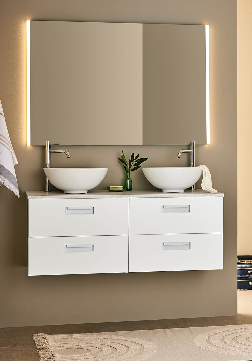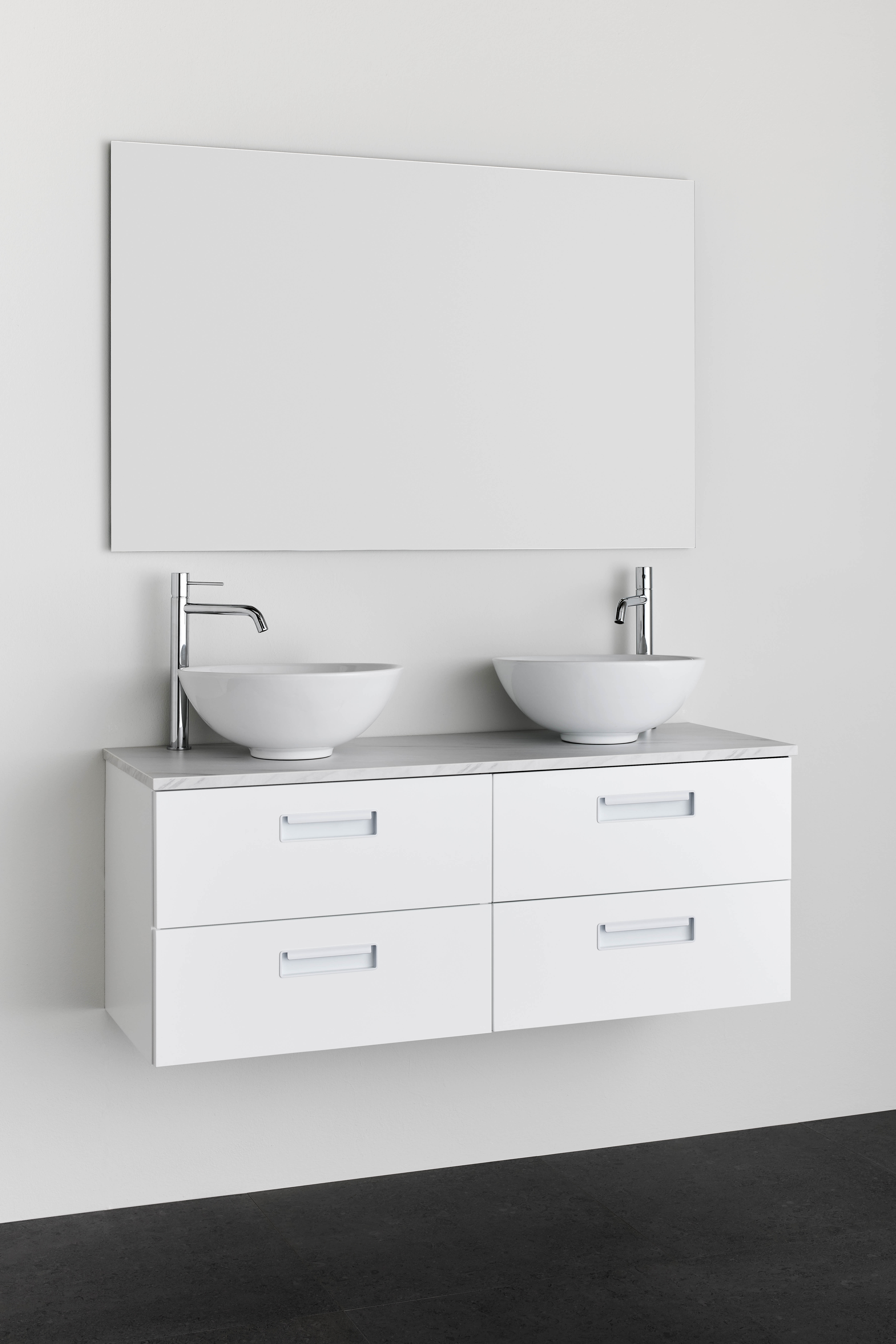 Noro Relounge badrumsskåp med bänkskiva i trendig design ger dig möjligheten att skapa ditt personliga badrum med sina unika mått och integrerade handtag. Relounge är en designad badrumsmöbel som ger en lyxig känsla och passar även ett smalt badrum. Relounge finns med vit matt finish samt svart trästruktur och i flera bredder, och chansen är stor att du hittar något som passar just ditt badrum. Finns med vit matt finish samt svart trästruktur och i flera bredder och chansen är stor att du hittar något som passar just ditt badrum. Bänkskivan är av MDF med slittålig yta av melamin. Välj till ett av våra fina fristående tvättställ. Levereras monterad, förberedd för både vägg- och golvavlopp. Enkel installation med justerbara upphängningsbeslag. Köp till bottenventil, avloppssats, eluttag och tvättställsblandare.