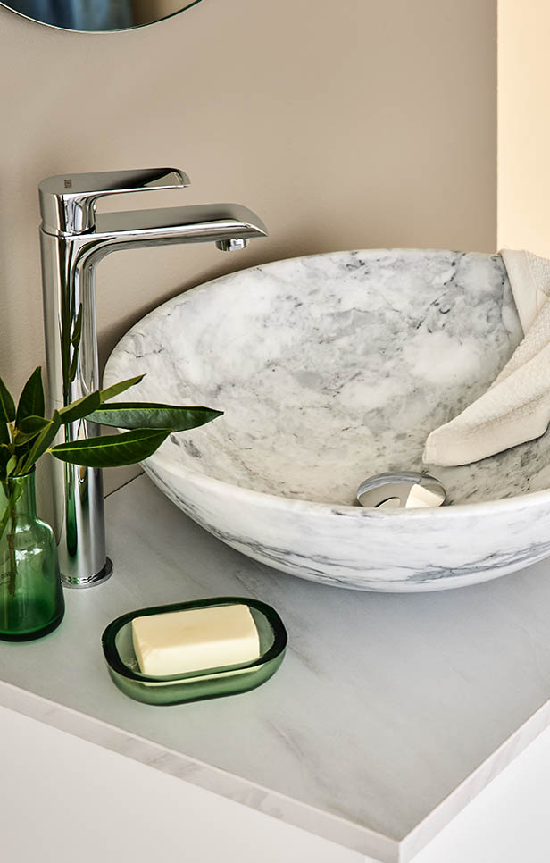- Porslinstvättställ eller bänkskiva med slitstark yta