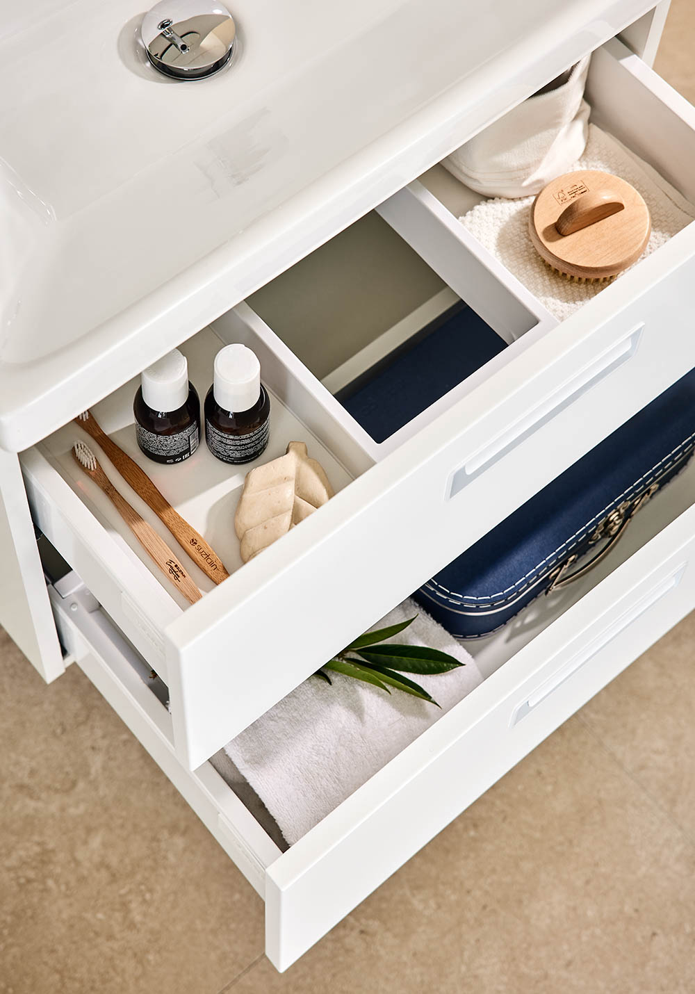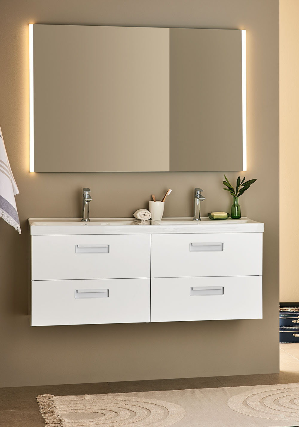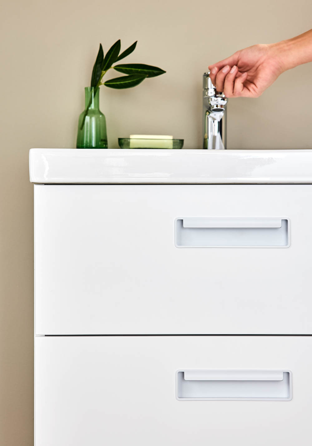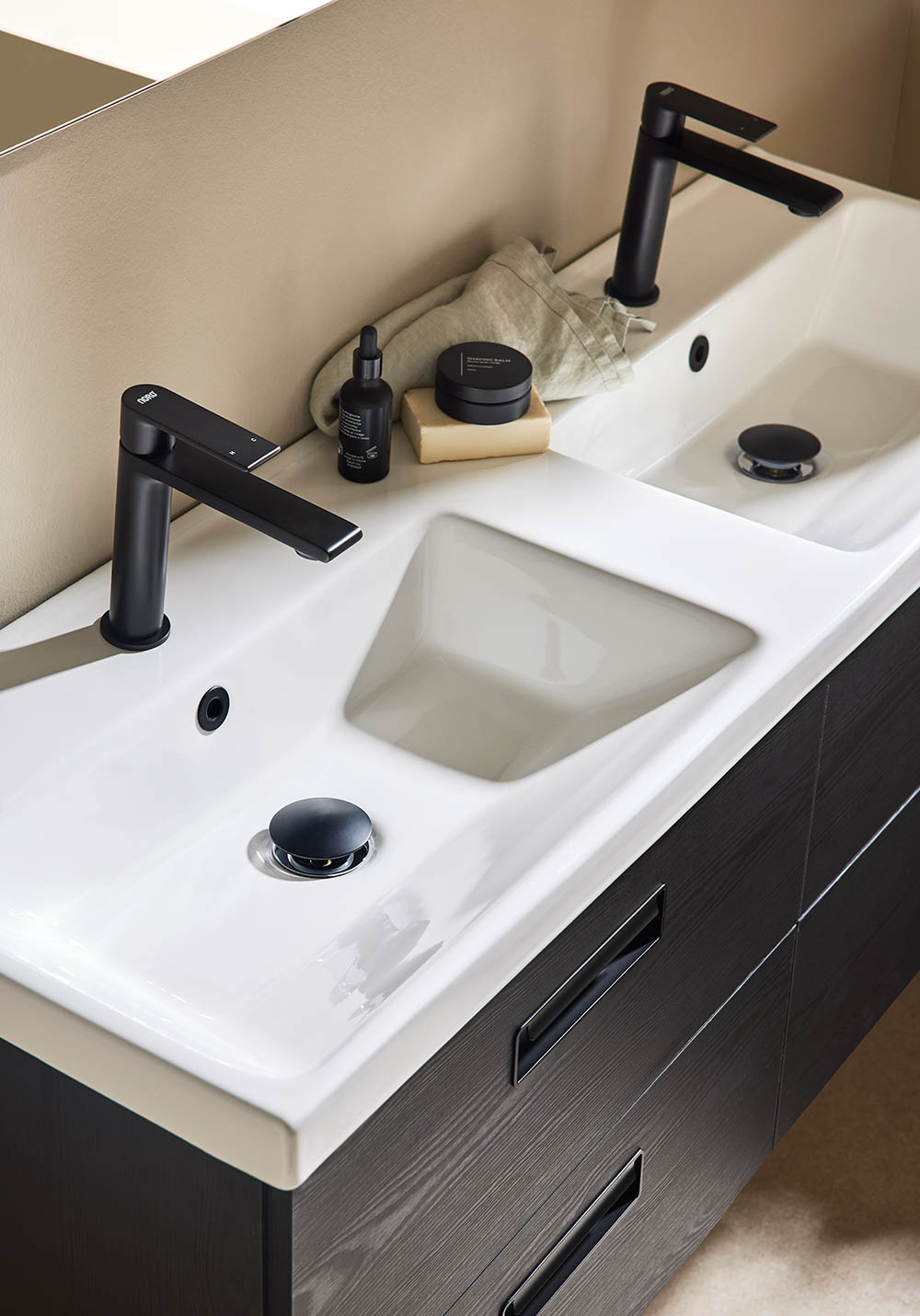 Noro Relounge badrumsskåp med porslinstvättställ i trendig design ger dig möjligheten att skapa ditt personliga badrum med sina unika mått och integrerade handtag. Relounge är en designad badrumsmöbel som ger en lyxig känsla och passar även ett smalt badrum. Finns med vit matt finish samt svart trästruktur och i flera bredder och chansen är stor att du hittar något som passar just ditt badrum. Det nedsänkta tvättstället i porslin har en rymlig och mjukt formad ho, samt överfyllnadsskydd. Levereras monterad, förberedd för både vägg- och golvavlopp. Enkel installation med justerbara upphängningsbeslag. Köp till bottenventil, avloppssats, eluttag och tvättställsblandare.