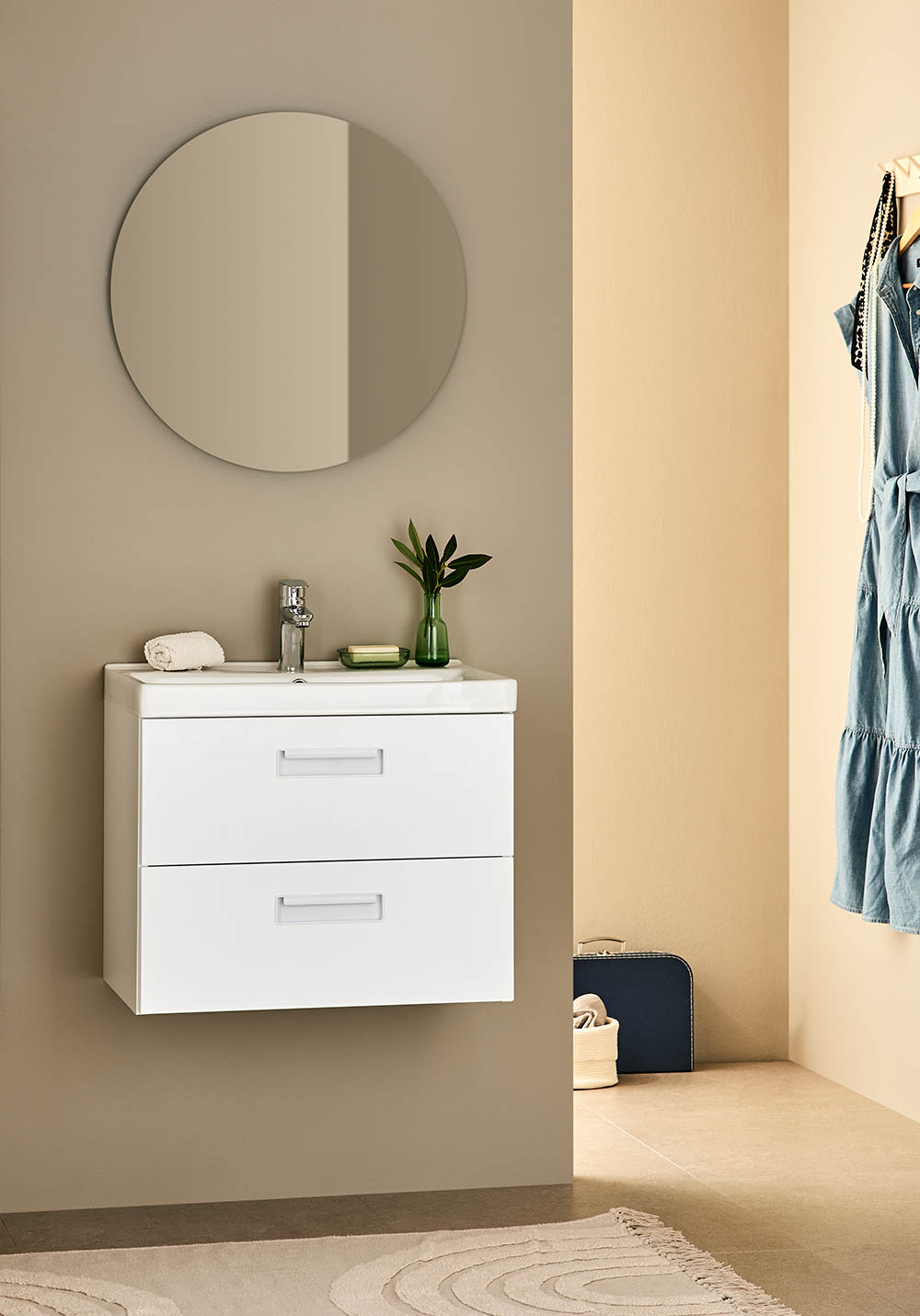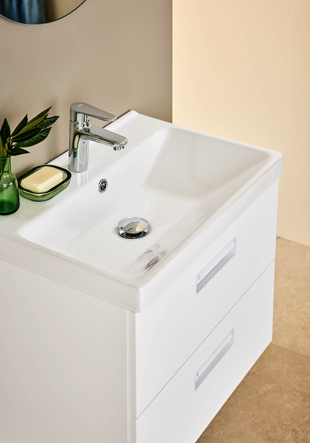 Noro Relounge badrumsskåp med porslinstvättställ i trendig design ger dig möjligheten att skapa ditt personliga badrum med sina unika mått och integrerade handtag. Relounge är en designad badrumsmöbel som ger en lyxig känsla och passar även ett smalt badrum. Finns med vit matt finish samt svart trästruktur och i flera bredder och chansen är stor att du hittar något som passar just ditt badrum. Det nedsänkta tvättstället i porslin har en rymlig och mjukt formad ho, samt överfyllnadsskydd. Levereras monterad, förberedd för både vägg- och golvavlopp. Enkel installation med justerbara upphängningsbeslag. Köp till bottenventil, avloppssats, eluttag och tvättställsblandare.