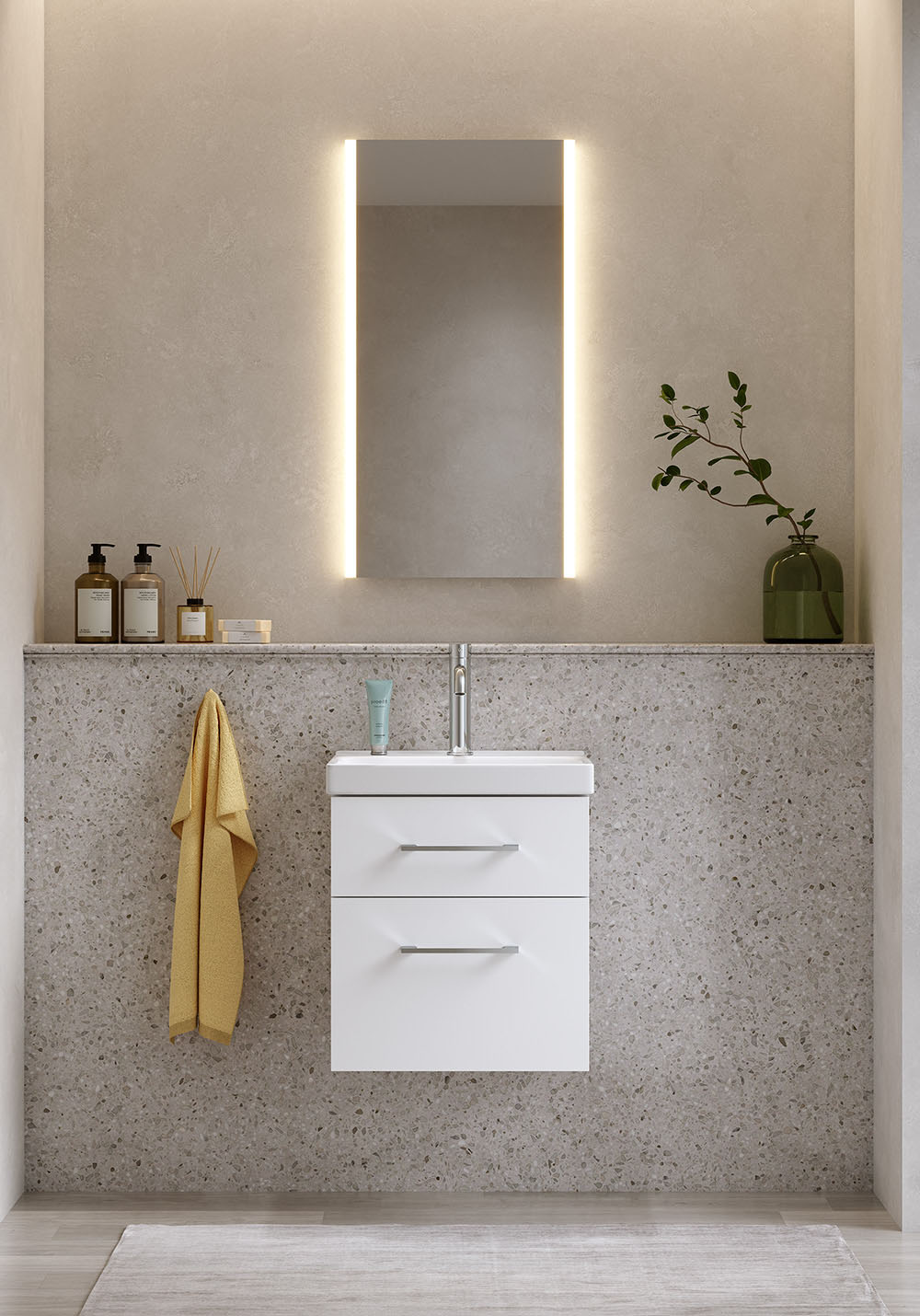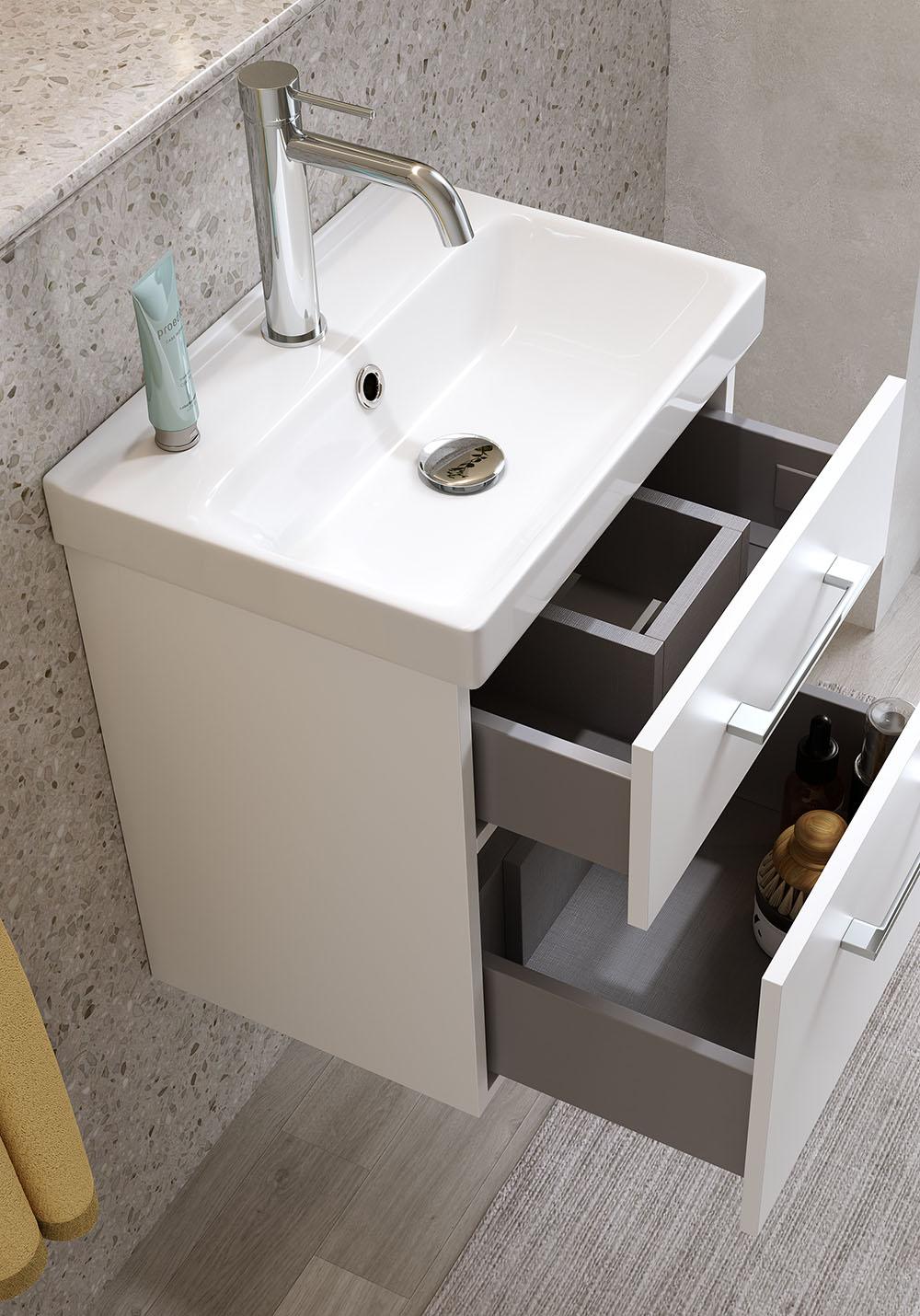Fix Trend 420 är en modern badrumsmöbel med porslinstvättställ; perfekt i ett litet badrum. Det grunda porslinstvättstället har ett djup på endast 320 mm och en praktisk avställningsyta, medan överfyllnadsskyddet ger extra trygghet i vardagen.