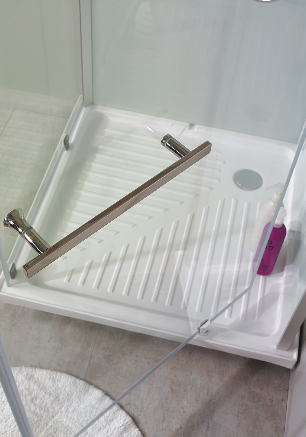 Silvermatt finish. 5mm härdat säkerhetsglas. Bakväggar i svart eller vitt säkerhetsglas. Kar i sanitetsakryl med avtagbar front. Handtag i rostfritt stål. Duschkabin i aluminium och rostfritt stål. Levereras med 3-funktions duschset. Magnetfunktion vid stängning. Anpassade för blandare C-C 150–160mm för kabingenomföring ½". Rostfritt svetsat stativ. Handtag ingår.