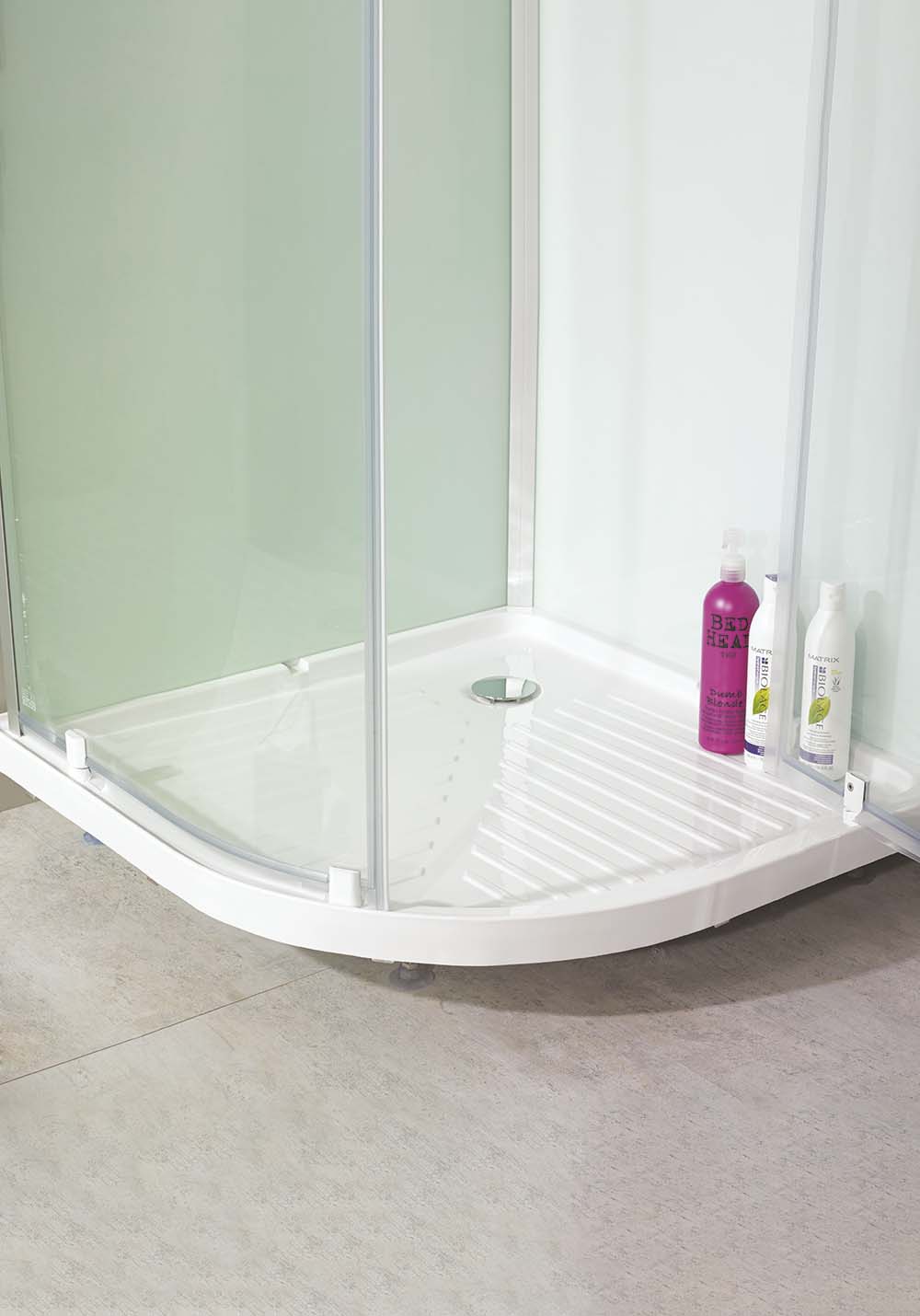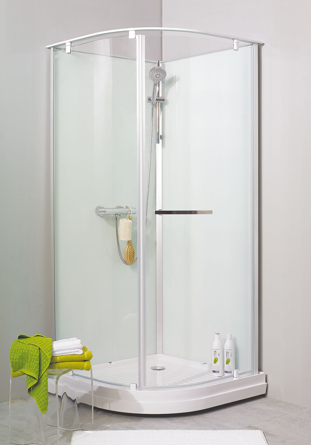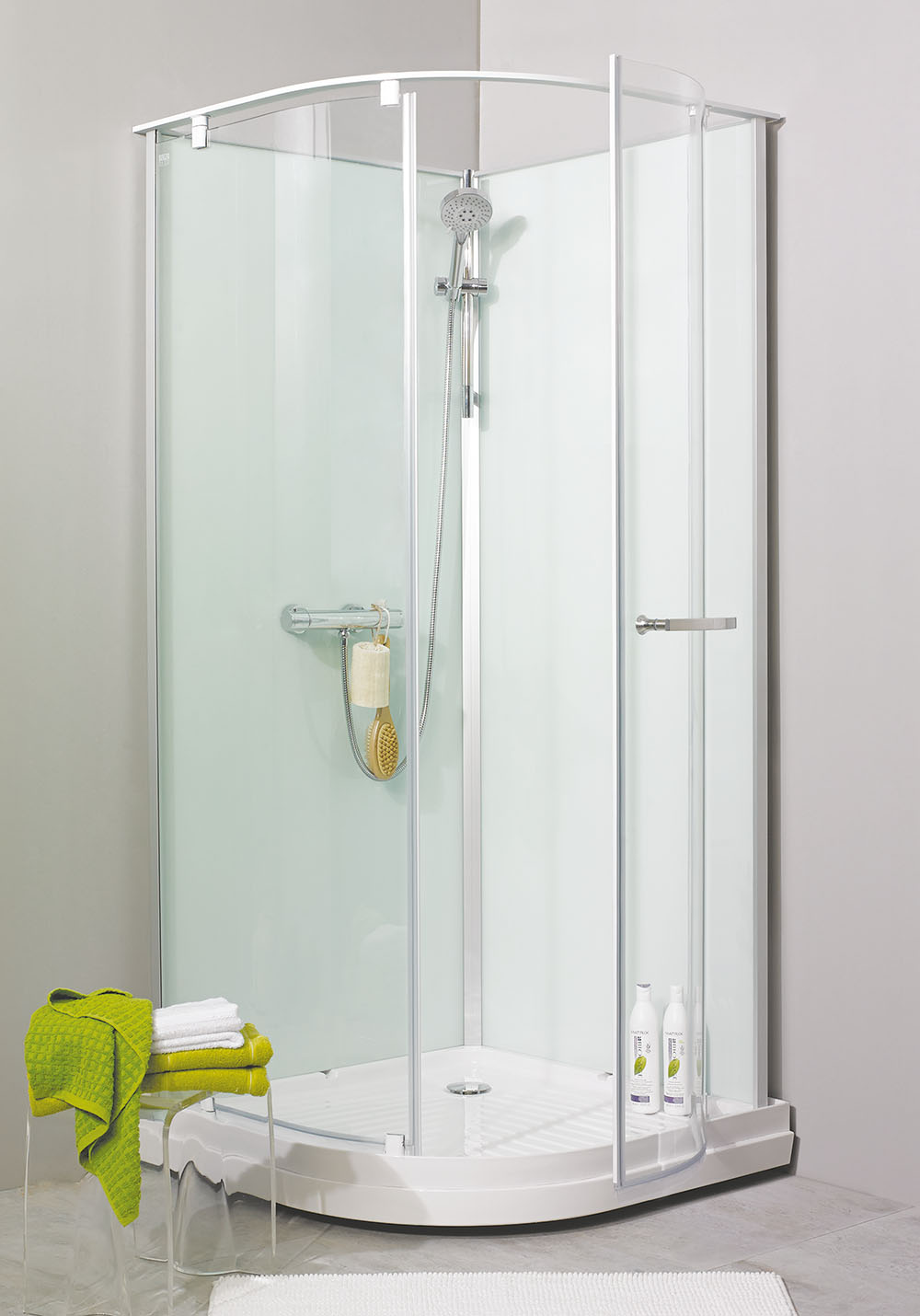 För att underlätta rengöringen av duschdörrar och duschväggar har duscharna stora släta ytor och profiler utan djupa skåror. Missfärgningar tas bort med citron eller vinsyra; skölj noga efteråt. Kalkfläckar tas bort med 50 grader varm hushållsättika: gnid in, låt verka, skölj bort. Upprepa om fläckarna är svåra. Fettfläckar tas bort med rödsprit. Använd inte rengöringsmedel som är etsande, syrahaltiga eller slipande eftersom det kan ge bestående skador på ytan.