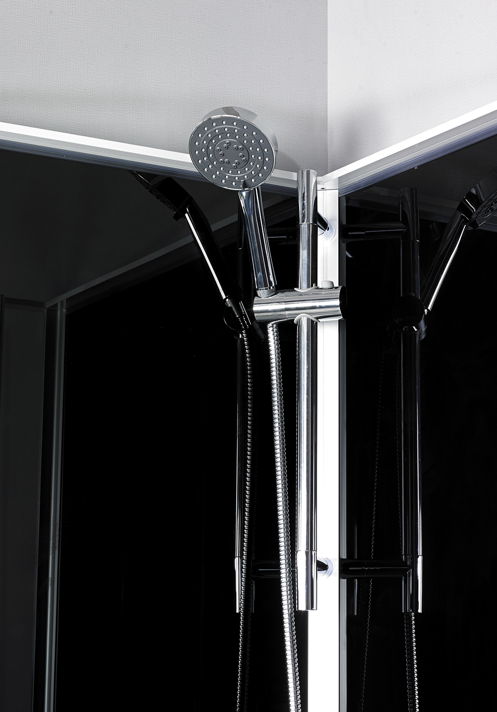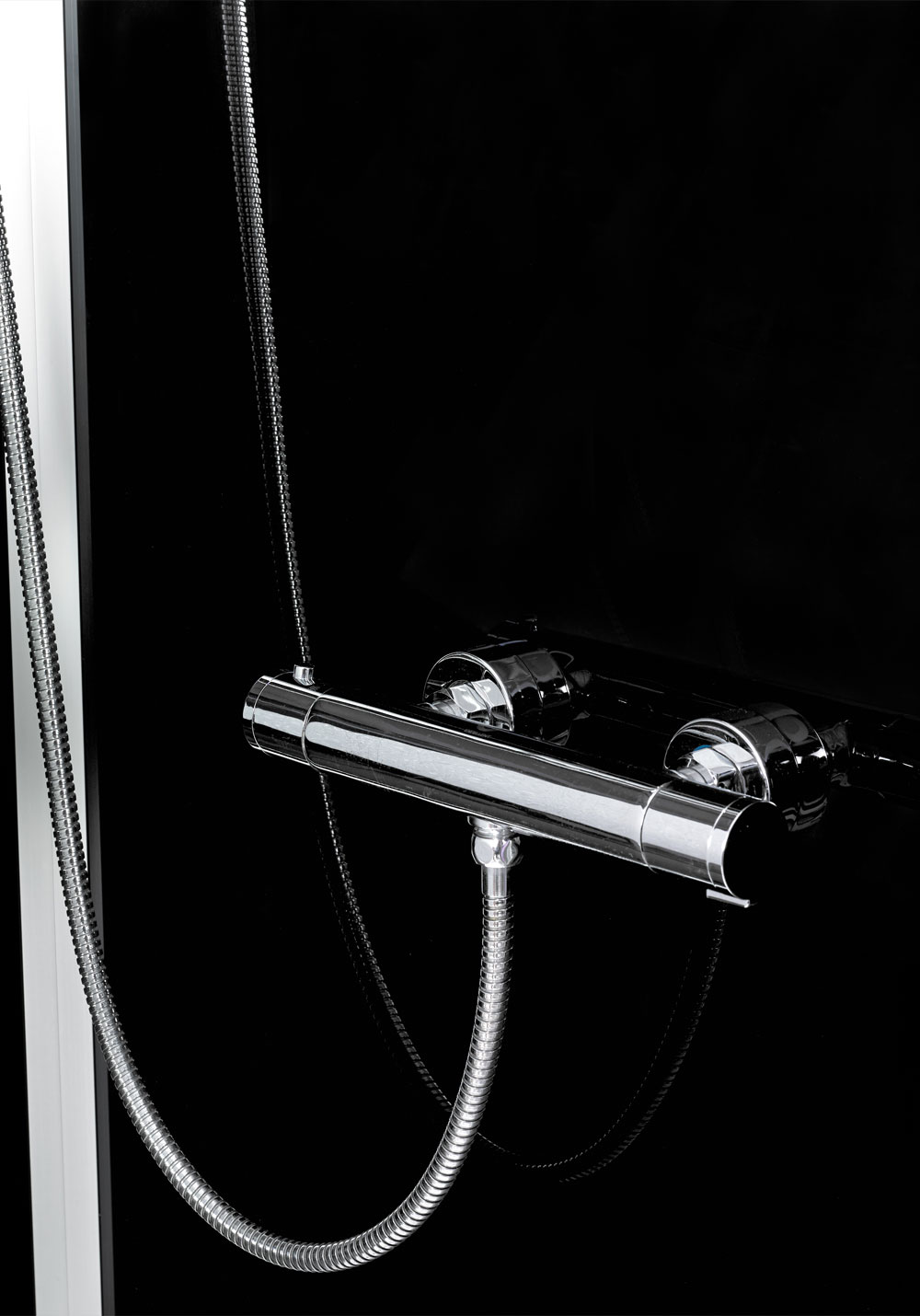 Silvermatt finish. 5mm härdat säkerhetsglas. Bakväggar i svart eller vitt säkerhetsglas. Kar i sanitetsakryl med avtagbar front. Handtag i rostfritt stål. Duschkabin i aluminium och rostfritt stål. Levereras med 3-funktions duschset. Magnetfunktion vid stängning. Anpassade för blandare C-C 150–160mm för kabingenomföring ½". Rostfritt svetsat stativ. Handtag ingår.