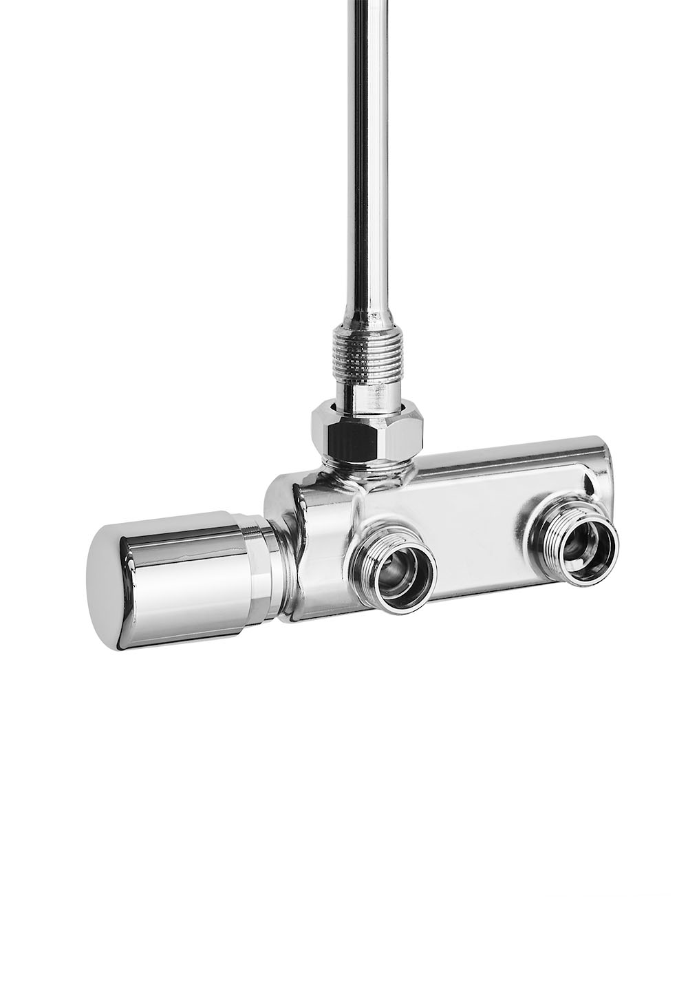 Stilren etthålsventil med inkommande anslutning i cc60 i vinkel som möjliggör anslutning av din handdukstork till det centrala vattenburna värmesystemet. Reglera värmen via det manuella reglaget. Tillverkad i gediget material och med kromad yta.