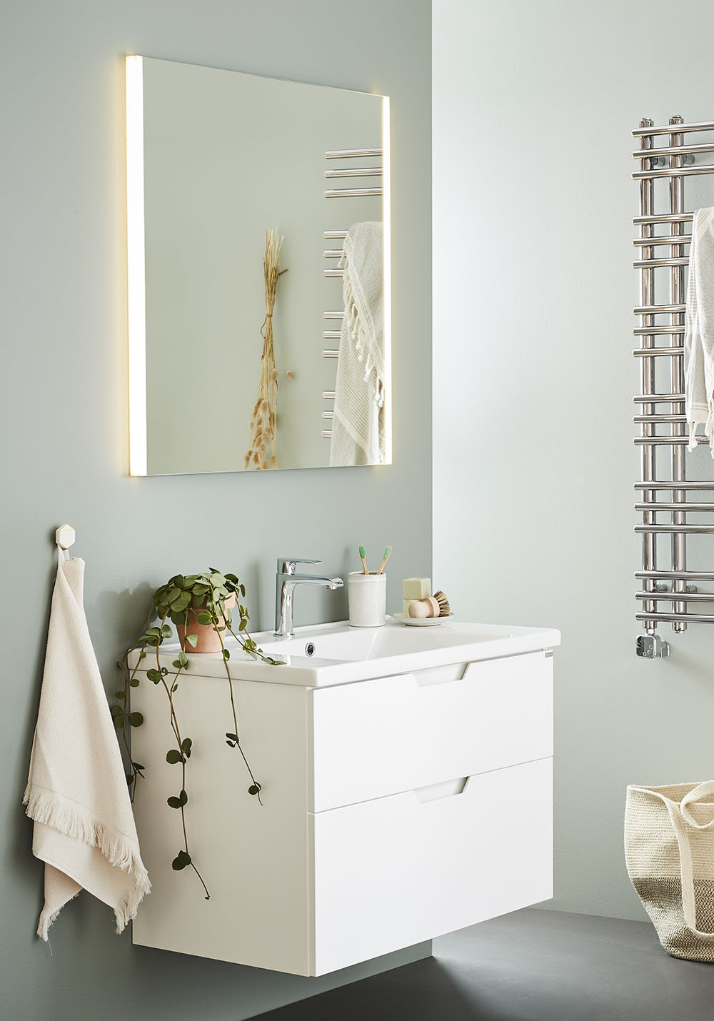 Stilren spegel med LED-belysning på sidorna som lyser utåt och rakt fram och ger bra belysning vid tex. sminkning och rakning. Varmvitt ljus på 3000K. IP44.