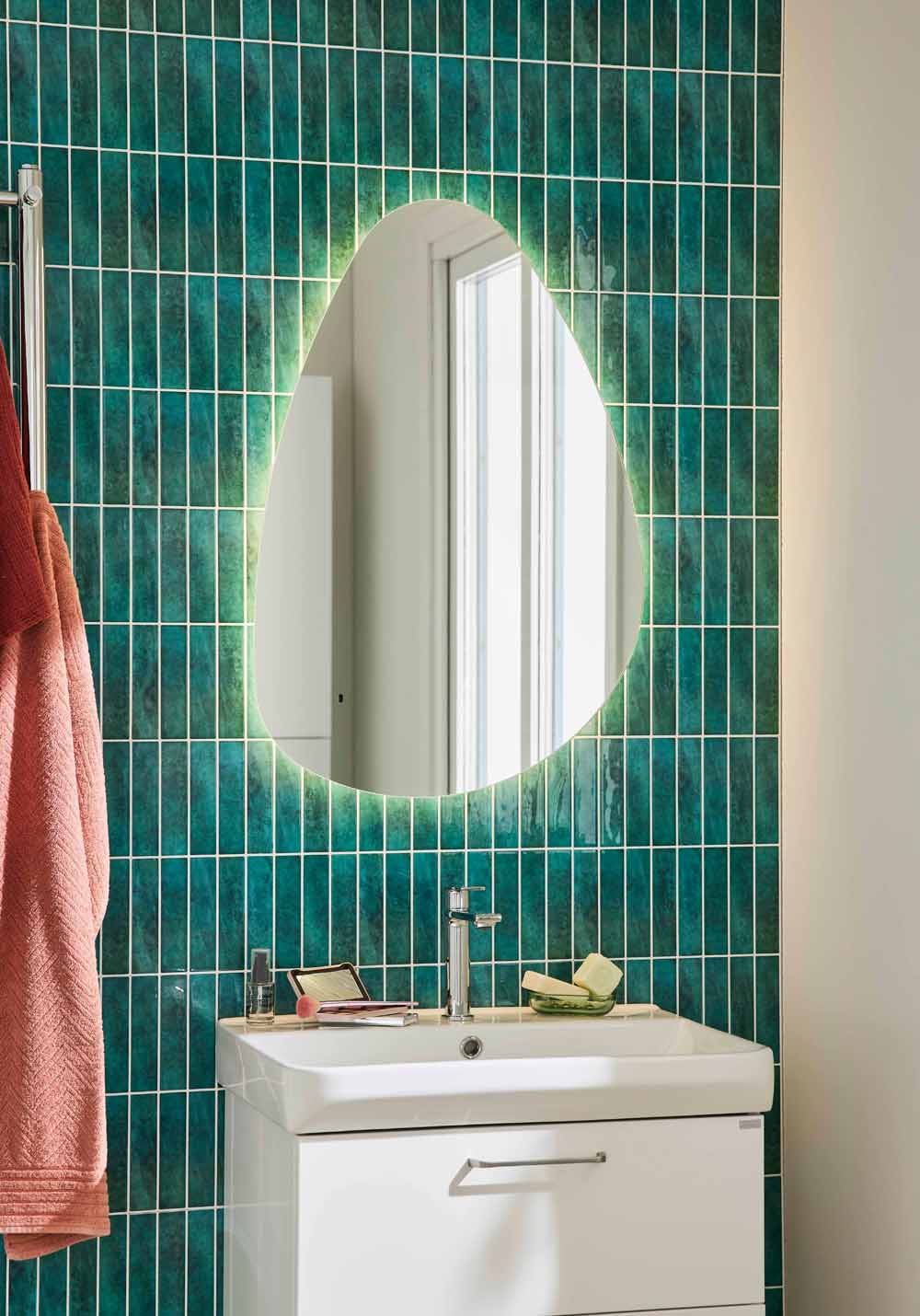 Badrumsspegel Glow har runda former och bakgrundsbelysning runtom som ger en stämningsfull belysning i badrummet. Ljusstyrkan kan dimmas och ljuset slås av och på via rörelsesensor (IR) för att undvika fingeravtryck på spegeln. Varmvitt ljus 3000K, IP44.