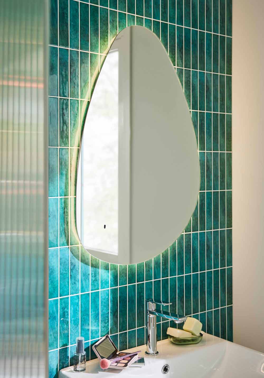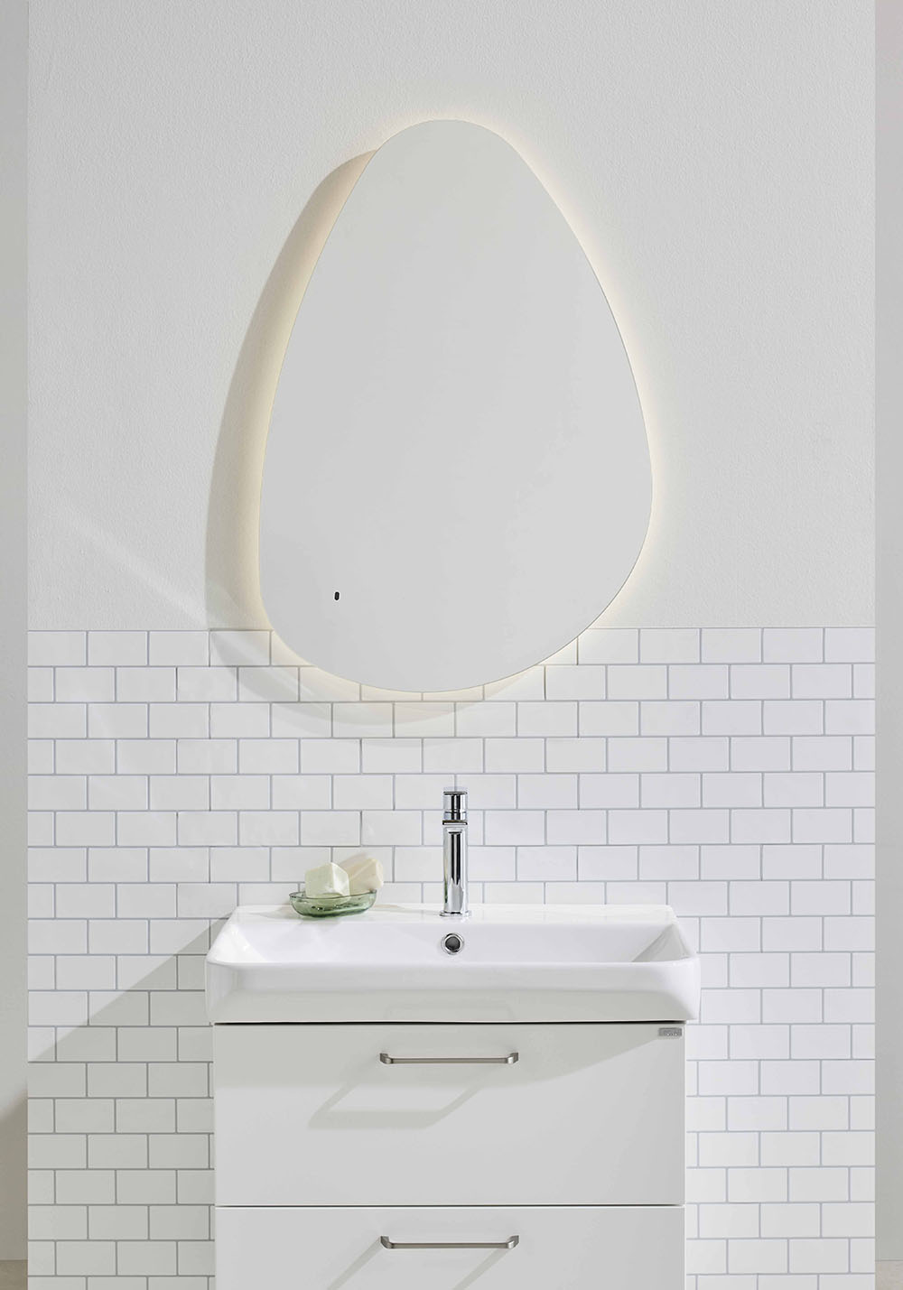 Badrumsspegel Glow har runda former och bakgrundsbelysning runtom som ger en stämningsfull belysning i badrummet. Ljusstyrkan kan dimmas och ljuset slås av och på via rörelsesensor (IR) för att undvika fingeravtryck på spegeln. Spegeln har en minnesfunktion som kommer ihåg senaste ljusstyrka när den slås av och på. Varmvitt ljus 3000K, IP44.