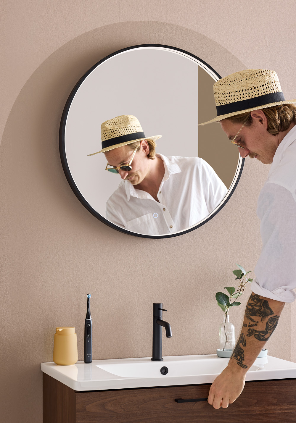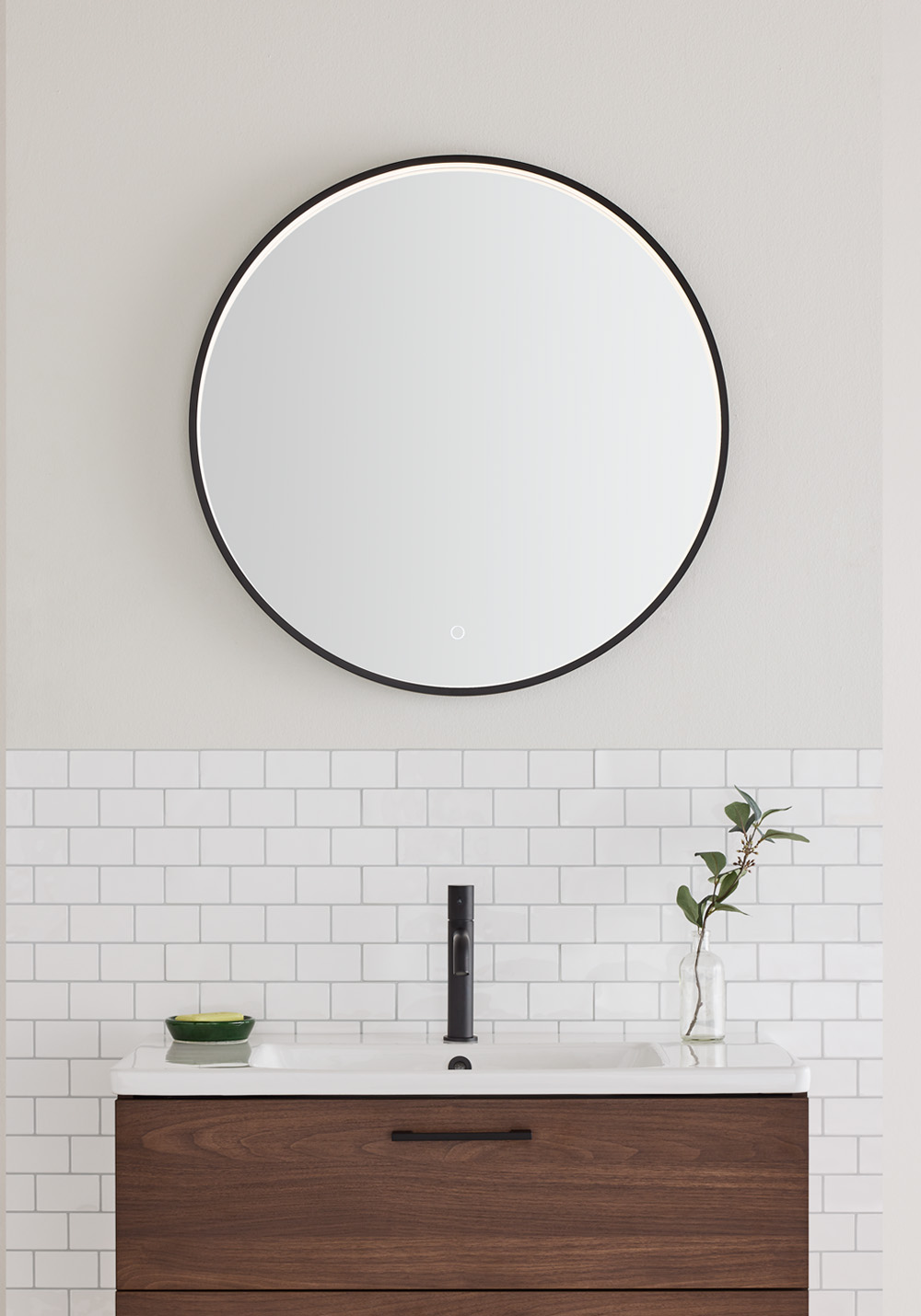 Noro Mood Round är en elegant spegel med svart ram och integrerad LED-belysning. Justerbar ljustemperatur mellan varmt och kallt med touchfunktion. IP44-klassning för badrumsmiljö.